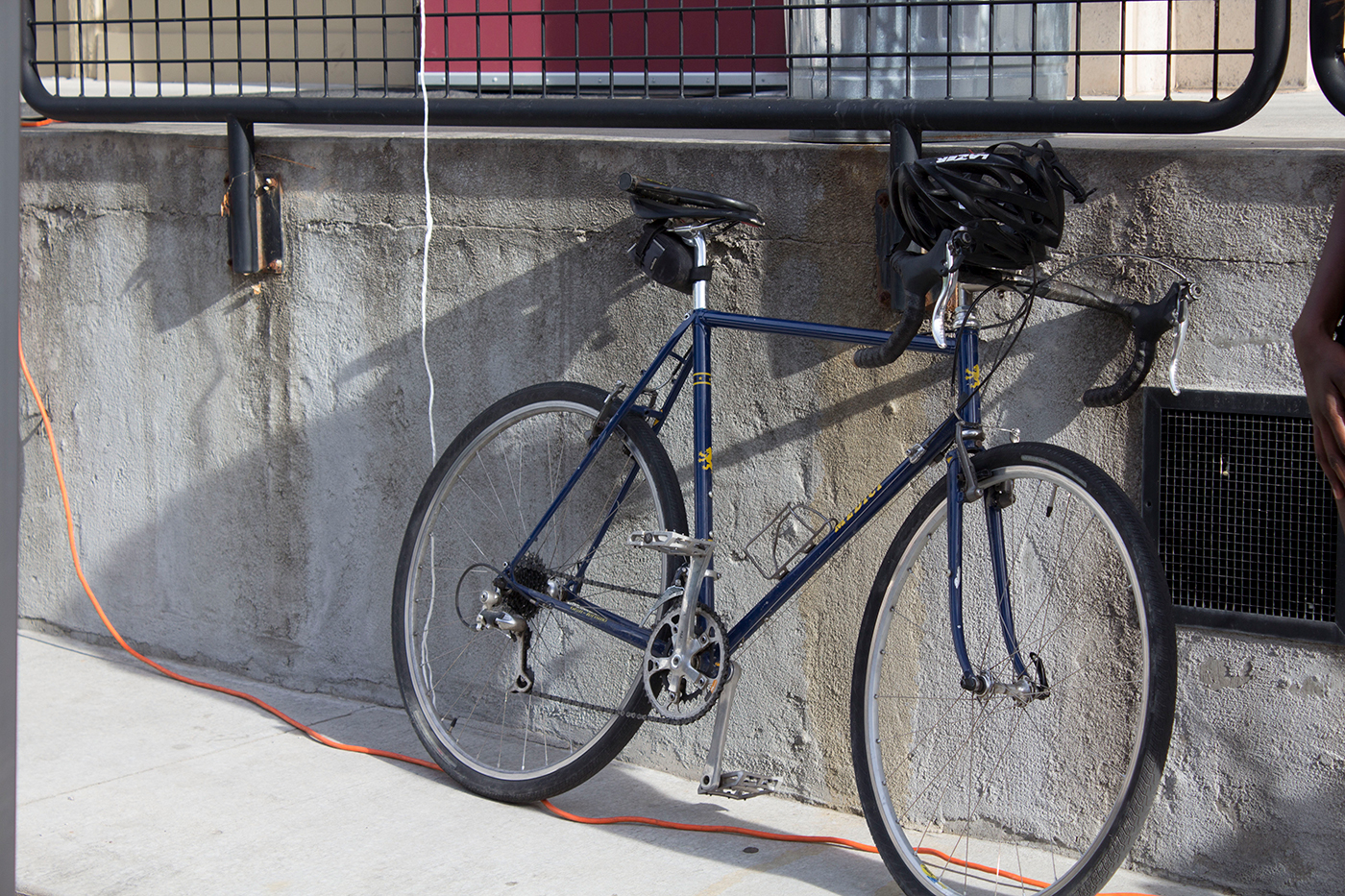 Kenna O, 1st place finisher in the women’s category, sits on the sidewalk with her speedy road cycle.