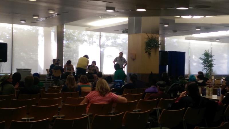 I had to see what the second floor looked like. All I had seen so far were half-attempted costumes and bored looking bike policemen. I went upstairs and the scene was similar to the one downstairs. Only a few costumed kids wandering around, artists packing up their booths and not much else. There was a Brony (dudes who just absolutely love My Little Pony) panel happening in the area of the map deemed the Video Game Room, and ain’t no way I’m walking into a Brony panel. In the Viewing Room was an AMV contest. A room half full of people watching music videos set to different anime shows. No one held papers or ballots to vote, so I can really only assume it was a fun time for people who created these videos to sit, share, and watch all of the submissions. Of everything I saw (or didn’t see, really) this was probably the coolest. The videos were well done and comical.