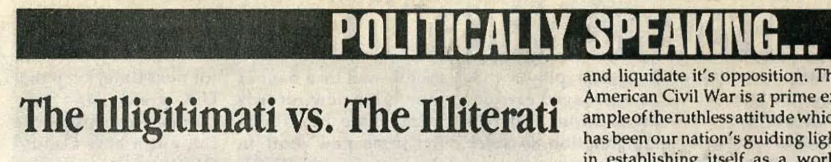 Next Month: Sex and drugs—is there enough of it around? Adam Weishaupt is the leader of the Bavarian “Washington’s” picture Illuminati, who is alleged to have died some two centuries ago. He believes that the time is ripe for the immunization of the eschaton and feels that SLUG is the only publication in the valley that he can trust to print his transmissions without editing or running subversive, subliminal Bush propaganda.